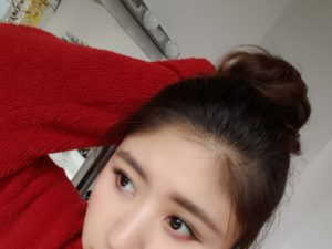 本日こちらのコーディネートでご機嫌の藤長🐦♪ 赤のニットに合わせて目の下に赤を入れて髪はお団子スタイルです