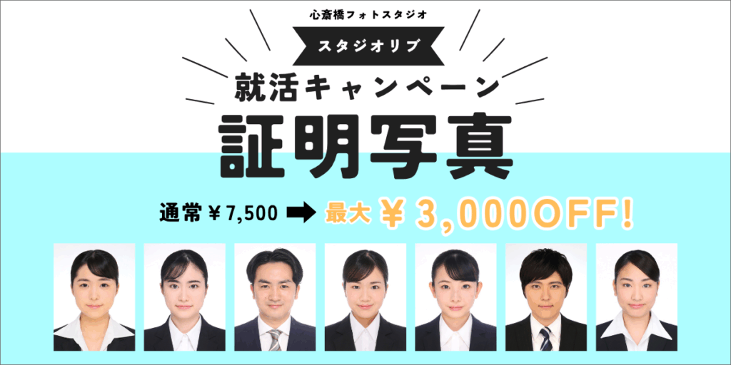 お得な就活証明写真のお知らせ! 大阪市・心斎橋駅徒歩2分のフォトスタジオリブでは、お得な就活証明写真のキャンペーン実施中です! 通常価格¥7,500(税込)を3つの割引対象で最大¥3,000(税込)の割引キャンペーン中です。 詳細は、こちらの就活特設ページをご確認ください♪