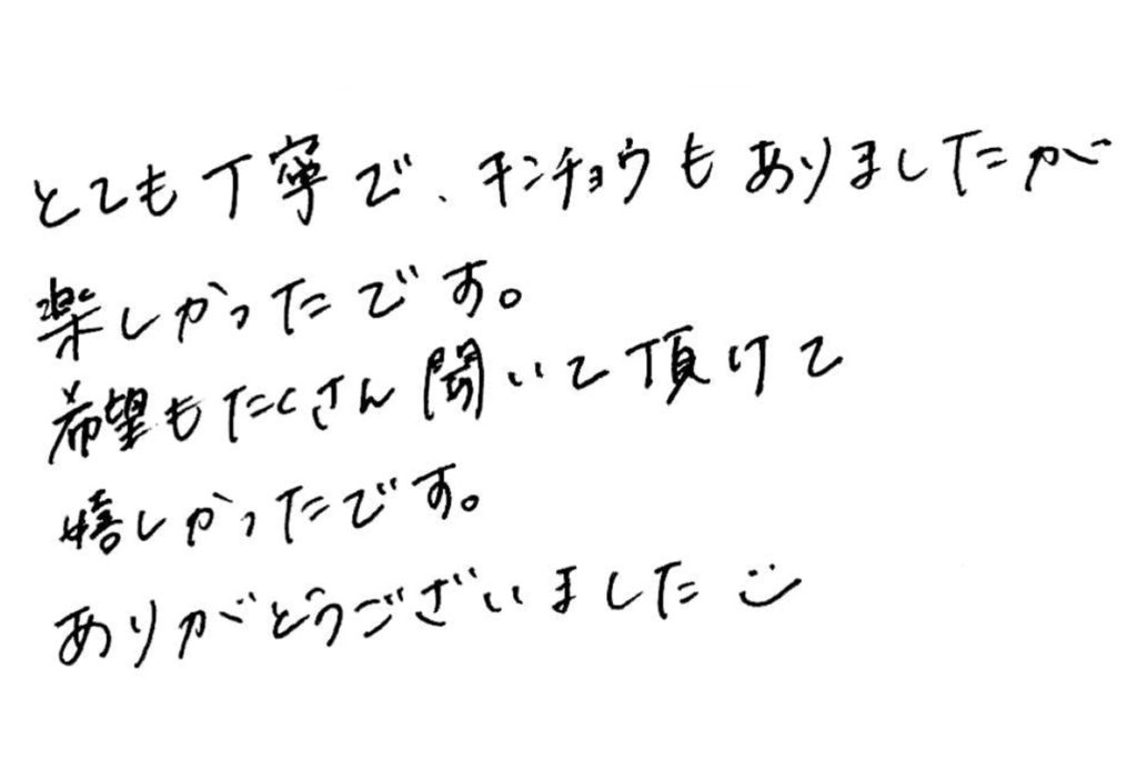 2023.11.25 お客様の声 580 演奏会プロフィール写真でご来店頂きましたお客様より とても丁寧で、キンチョウもありましたが 楽しかったです。 希望もたくさん聞いて頂けて 嬉しかったです。 ありがとうございました。