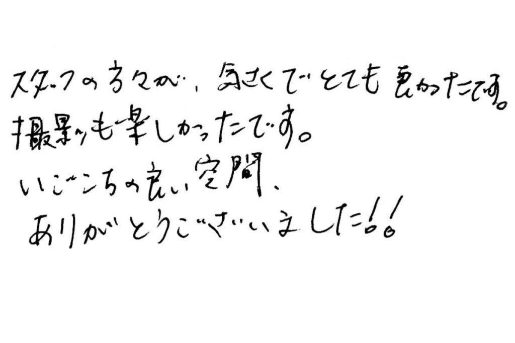 2023.11.27 お客様の声 610 プロフィール写真でご来店頂きましたお客様より スタッフの方々が、気さくでとても良かったです。撮影も楽しかったです。いごこちの良い空間、ありがとうございました!!