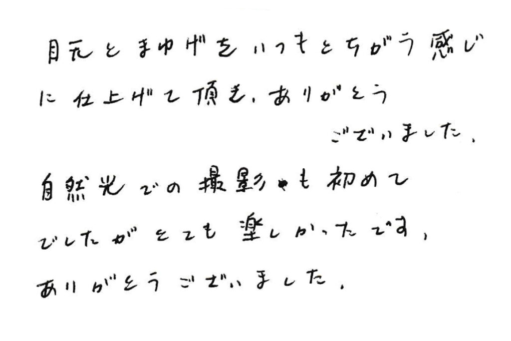 2025.04.28 お客様の声 678 お見合い写真でご来店のお客様より 目元とまゆげをいつもとちがう感じ に仕上げて頂き、ありがとうございました。 自然光での撮影も初めて でしたがとても楽しかったです。 ありがとうございました。