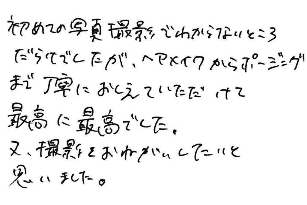 2026.01.20 お客様の声 721 オーディション写真でご来店のお客様より 初めての写真撮影でわからないところだらけでしたが、ヘアメイクからポージングまで丁寧におしえていただけて最高に最高でした。又、撮影をおねがいしたいと思いました。